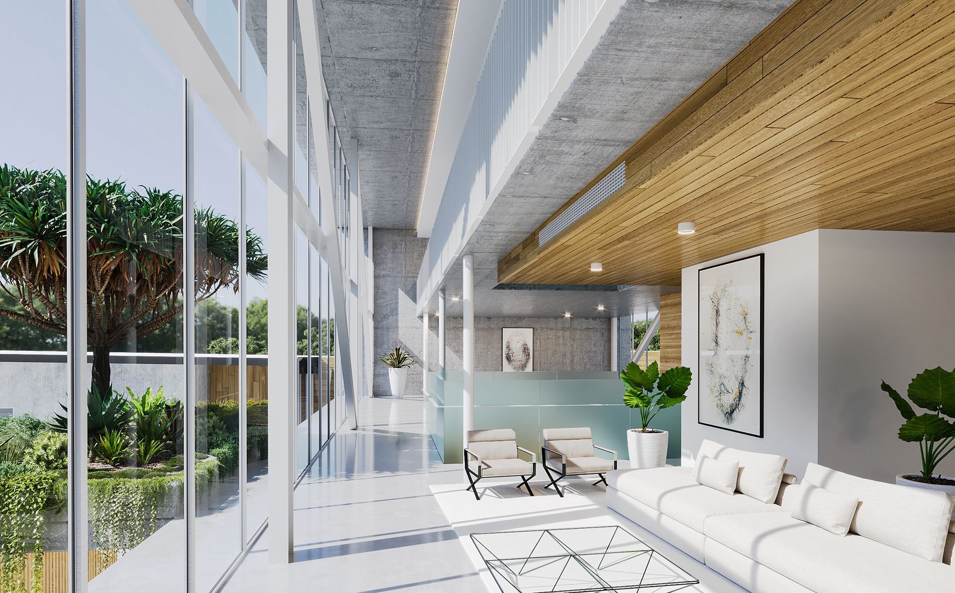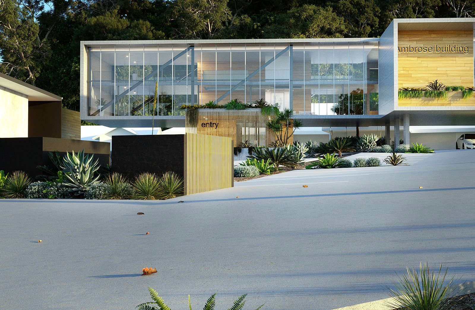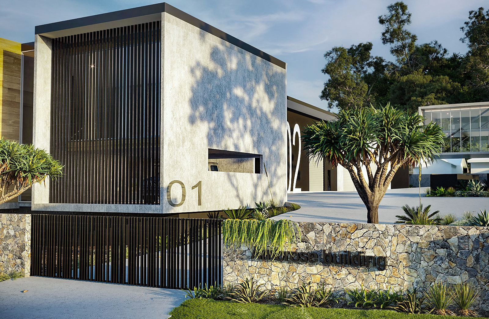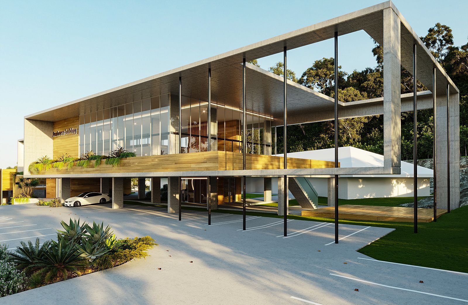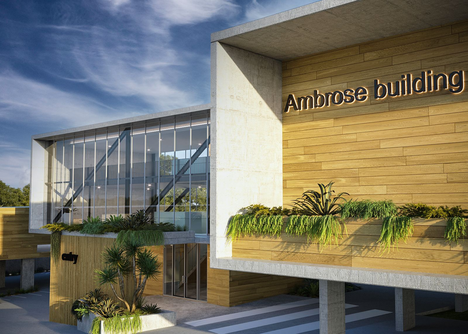 Located in Kunda Park on the Sunshine Coast, the Ambrose Office Headquarters responds to a complex industrial site and subtropical climate through a contemporary, elevated building form. The design lifts the office above ground to maximise car parking and site efficiency, while creating a strong visual connection between new and existing buildings. A large wraparound verandah provides sun shading and passive cooling, with hanging gardens softening the built form and connecting to the surrounding landscape. Internally, a central core and open mezzanine layout create light-filled, functional workspaces with strong visual connectivity. The project reflects a practical, site-driven approach to commercial building design, balancing industrial requirements with a refined architectural outcome.